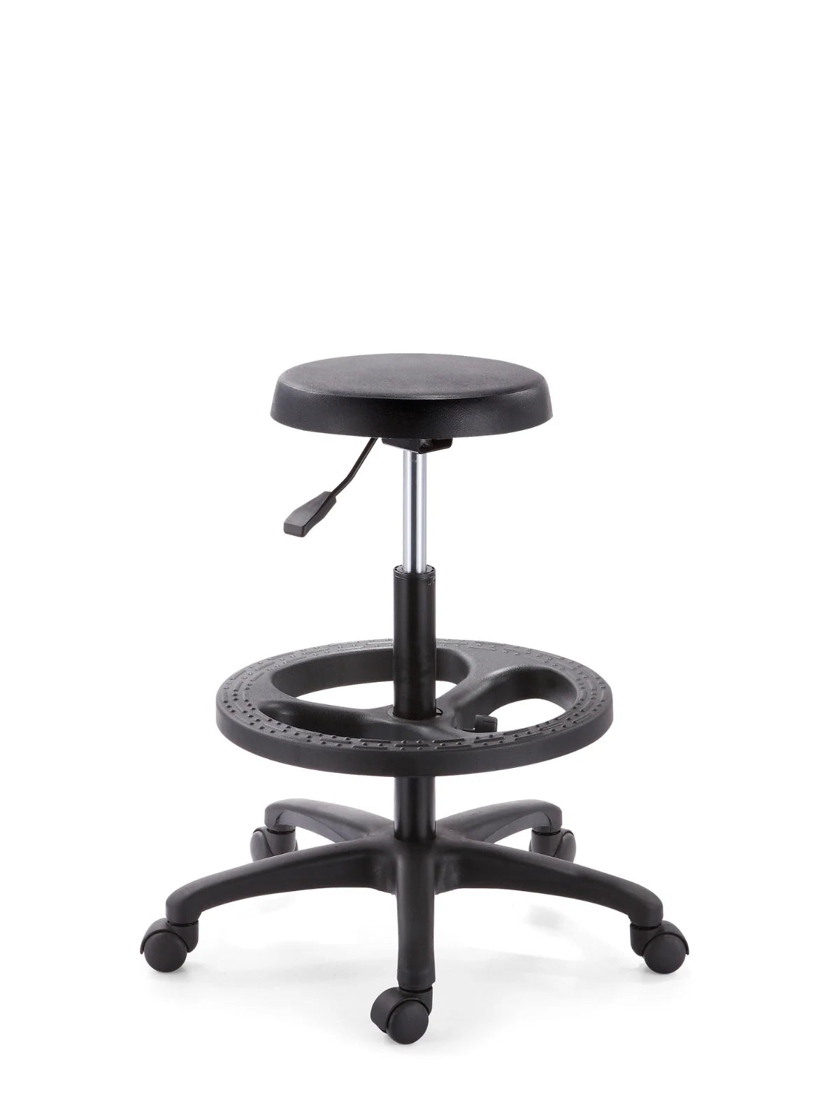 Banco Cajero en negro diseñado para máxima comodidad y durabilidad. Cuenta con acolchado de poliuretano compacto de uso industrial sobre estructura de triplay, ajuste de altura mediante mecanismo de pistón con palanca, y reposapiés circular integrado para soporte adicional. Base pentagonal de nylon de 24" equipada con 5 ruedas giratorias de 50mm que garantizan movilidad fluida. Ideal para espacios comerciales que demandan resistencia y funcionalidad. Envío rápido y garantía de satisfacción incluida.